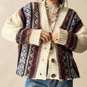 Apricot Boho Style Women's Geometric Striped Knitted Cardigan