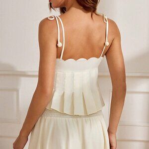 Apricot Boho Women's Floral Print Pompom Spaghetti Strap Scallop Cami Top