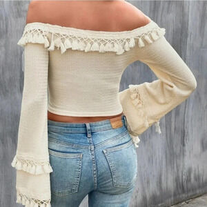 Apricot Boho Womens Off Shoulder Fringe Trim Flounce Sleeve Blouse