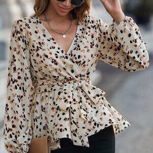 Apricot Casual Women's Allover Print Lantern Sleeve Belted Peplum Blouse