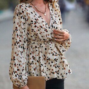 Apricot Casual Women's Allover Print Lantern Sleeve Belted Peplum Blouse