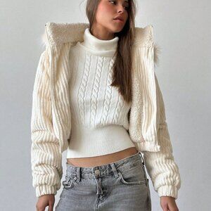 Apricot Casual Women's Corduroy Patchwork faux fur trim Hooded Short Padded Coat