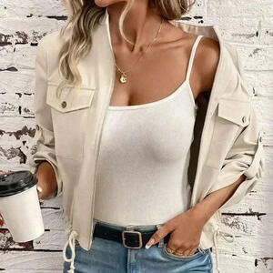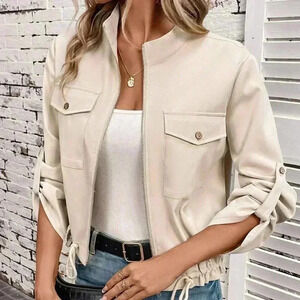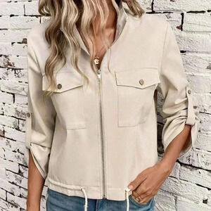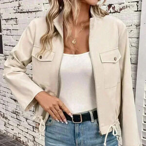 Apricot Casual Womens Flap Pocket Roll Tab Sleeve Drawstring Hem Zip Up Jacket
