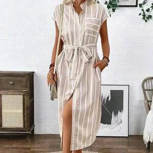 Apricot Casual Women's French-Style Striped Color-Block Shirt Dress