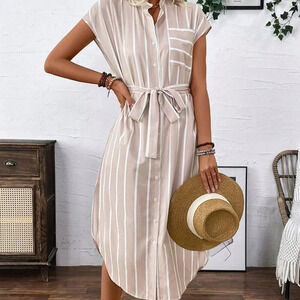 Apricot Casual Women's French-Style Striped Color-Block Shirt Dress