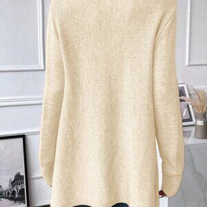 This apricot sweater dress features a casual, loose fit with long sleeves, making it perfect for spring or fall. The draped collar and asymmetrical design add a unique touch, while the fringe trim provides a stylish detail. With its cowl neck and wrap style, this plain sweater dress offers a comfortable and versatile option for any casual occasion.