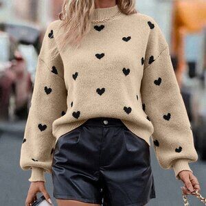 Apricot Casual Womens Heart Pattern Mock Neck Drop Shoulder Sweater
