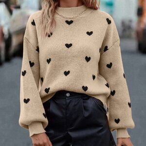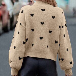 Apricot Casual Womens Heart Pattern Mock Neck Drop Shoulder Sweater