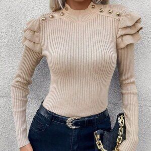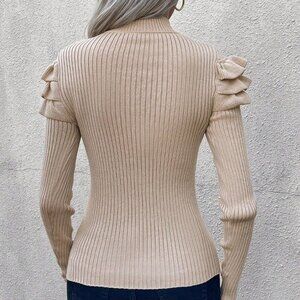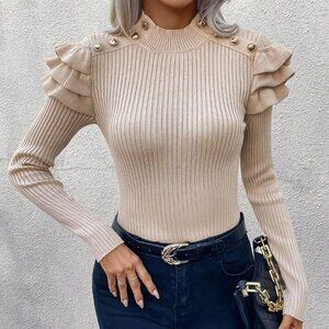 Apricot Casual Womens Mock Neck Button Detail Ruffle Trim Ribbed Knit Sweater