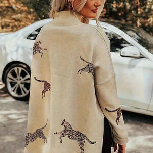 Apricot Casual Women's Mock Neck Leopard Print Long Sleeve Drop Shoulder Sweater