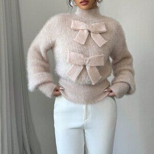 Apricot Casual Women's Stand Collar Bow Decor Sweater