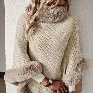 Apricot Casual Women's Turtleneck Fuzzy Trim Batwing Sleeve Poncho Sweater