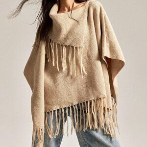 Embrace cozy style this late‑fall season with an oversized apricot knit poncho that drapes effortlessly. A fringe trim adds playful texture, while the asymmetrical neckline offers a modern twist on casual comfort. Long sleeves keep warmth in place, and the regular length provides a relaxed silhouette that pairs well with jeans, leggings or layered tops. Ideal for everyday outings or relaxed weekend plans, this piece blends soft knit feel with a breezy, oversized fit for effortless layering.