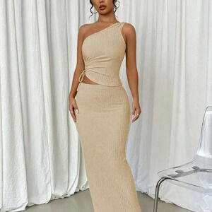 Apricot Elegant Women's Drawstring Shoulder Top And Long Midi Skirt Set