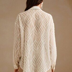 Apricot Elegant Women's Embellished Floral Long Sleeve Sheer Jacquard Shirt