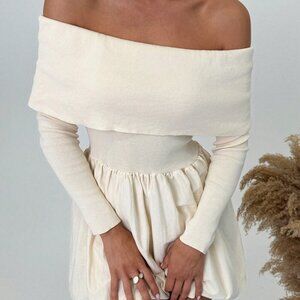 Apricot Elegant Women's Off Shoulder Long Sleeve A-Line Short Knitted Dress
