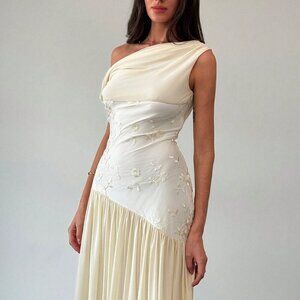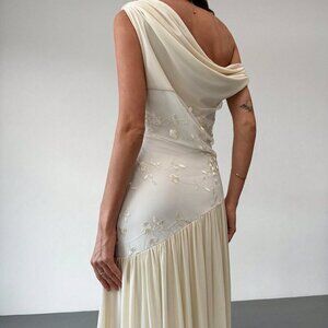Apricot Elegant Women's Off Shoulder Mesh Floral Embroidered Maxi Dress