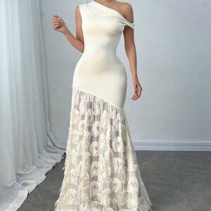 Apricot Elegant Women's Twist Shoulder Slim Fit Bodycon Fish Tail Jacquard Dress