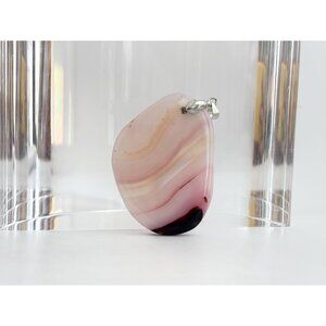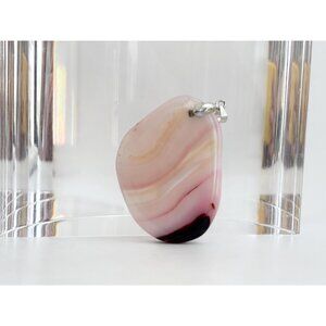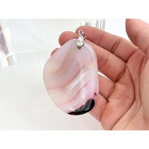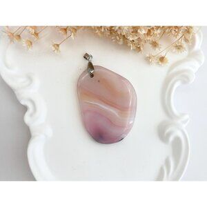 Gorgeous pink-ish - orange-ish freeform-ish oval shaped agate crystal pendant. The bail is sterling silver The stone is polished and shiny with pink, purple and orange hues. Stunning piece. Agate is a variegated form of chalcedony which is a fibrous form of quartz. marked with 925.