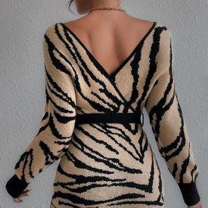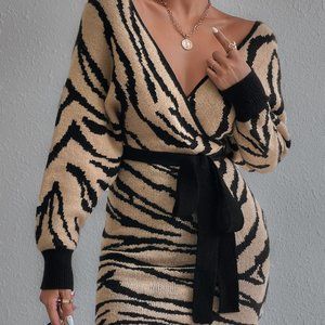 Apricot Preppy Womens Zebra Striped Pattern Batwing Sleeve Belted Sweater Dress