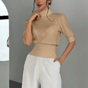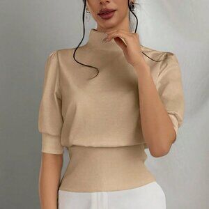 Apricot Women's Color Stand Collar Waist Cinched Bubble Sleeve Shirt