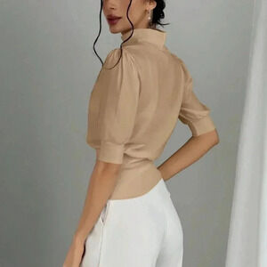 Apricot Women's Color Stand Collar Waist Cinched Bubble Sleeve Shirt