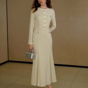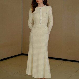 Apricot Women's Tweed Button Decor Bias Cut Dress
