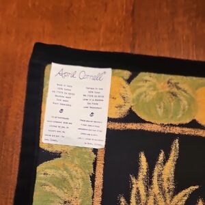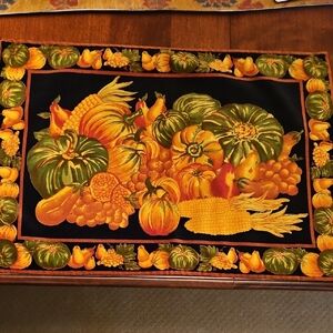 Elegant placemats with pumpkin and corn design. Ideal for fall table settings. 6 placements. Never used. 100% cotton. Black, orange, yellow and green. 19.5"x14"