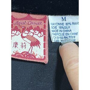 The April Cornell Button Down Silk Velvet Black Medium Vintage Retro Lagenlook Tunic is a stylish and versatile top for women. Made from luxurious silk and rayon with a velvet fabric type, this tunic features a solid black color with long sleeves and a collared neckline. The vintage retro design and oversized fit add a unique and bohemian touch, perfect for those who appreciate classic yet unconventional styles. The tunic also includes button accents, making it a comfortable and easy-care piece for everyday wear.