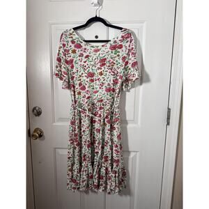 Features a vibrant allover pink, red, and green floral print with ruffled hem and short sleeves. Flowy midi length with gathered waist and removable tie belt for adjustable fit. Soft, lightweight feel perfect for spring and summer wear.