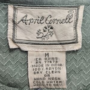 This April Cornell Front Tie Button Up Sage Green Top in size Medium is made from lightweight rayon fabric. This vintage top features a unique front tie closure and button accents. The 3/4 sleeves add to the relaxed fit, ideal for the summer, fall, and spring seasons. With a prairie cottage core and bohemian theme, this blouse is a stylish addition to any woman's wardrobe.