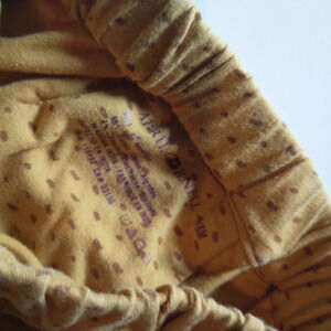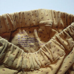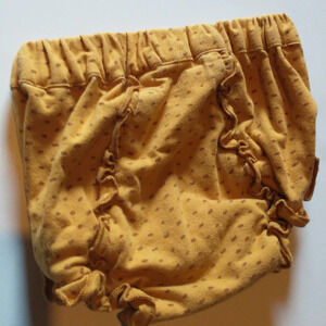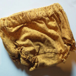 Marigold Yellow with warm orange splotch print. Elastic waistband. Ruffles on back. April Cornell runs a bit big, these fit best 3-9m.