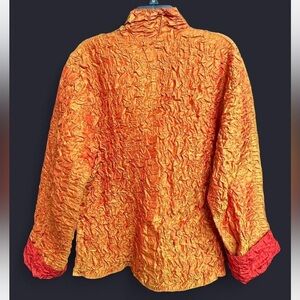 Orange and red silk like shimmer reversible button front jacket with a unique quilted texture. I love this Artsy Jacket!! It is relax fit, over sized, so comfortable.