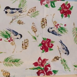 April Cornell table runner. Off white background with poinsettias, blue birds, pine cones and evergreens. 100% cotton. Measures approximately 17" X 90".