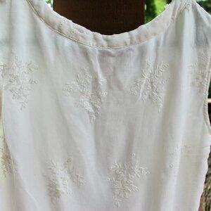 Ladies April Cornell white blouse. Had embroidery all over from and back. Fully line and in good condition. Has an "unfinished " like hem at the top. Feminine. Size Large, smoke free home. 19 inches pit to pit and 24 inches long. 100 percent rayon. In very good condition.