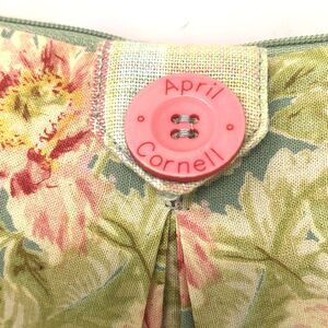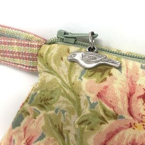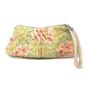 VTG Y2k Cottagecore classic April Cornell for Silvestri Wristlet in Splendour Sage Floral. Pretty Pink Logo Accent button, Zip closure, cute silver Bird charm and contrast striped wrist strap.#GardenGirl