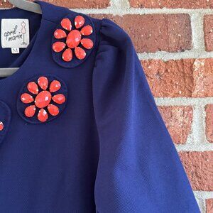 A royal blue textured fabric forms a classic mod silhouette, while oversized floral jewel embellishments in coral-orange add an unforgettable pop. Fully lined, with a back zipper closure and short puff sleeves for just the right touch of drama.