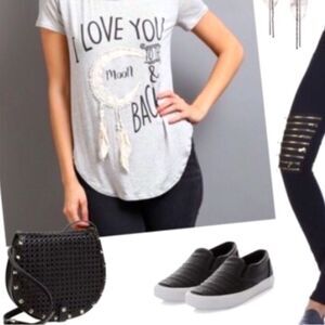 April Spirit Graphic Tee “I Love You to the Moon and Back”. Size M. Heather gray w wording in black and ivory boho appliqué. Feminine cut w scoop neck and rounded hem. Super soft 95% rayon 5% spandex. Looks great w leggings or denim. Especially cute in the summer w denim shorts. In perfect condition!