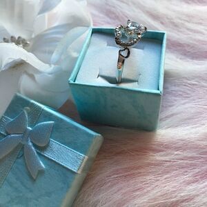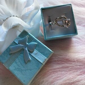 Heart ❤️ shaped clear crystal next to an open heart lined with clear crystals heart shapes on both sides of the band. Silver setting