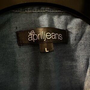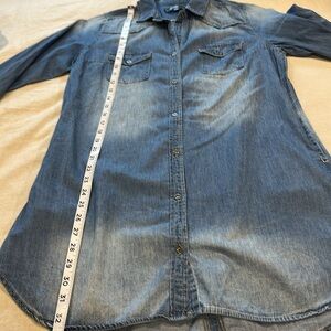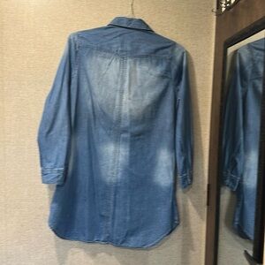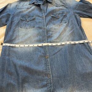 Stylish denim button-up shirt dress with long sleeves. Features chest pockets and a classic collar.