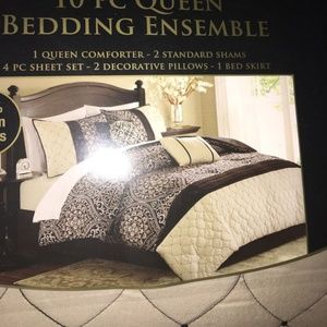 New in package. 1 queen Embroidered comforter, 1 black bed skirt, 2 standard shams, 2 Decorative embroidered Throw pillows (6 pieces total). Originally 10 piece set, missing sheet set.