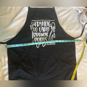 Apron in black with while lettering that says Trying To Earn Brownie Points.