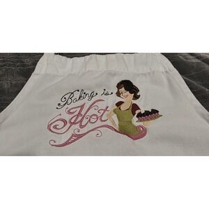 The product is a full white apron featuring handmade embroidered designs of a female or woman with the words, " Baking is Hot", or chef. It is suitable for all occasions and is one size fits all. Made from a cotton blend material, this modern-style apron is unique and perfect for baking and cooking enthusiasts. It is handmade in the United States. New Without Tags. Washed. Beautiful & clean. Measurements: Chest 30", Length 31".
