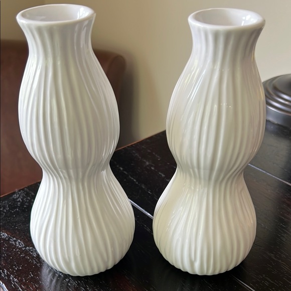 These white ceramic vases feature a ribbed texture and a modern hourglass shape, making them perfect accent pieces for any room. Their clean design and subtle shadows add a touch of elegance to your decor. These measure about 8.5 inches tall. Both vases included for one price. Smoke free home. Thanks for looking!