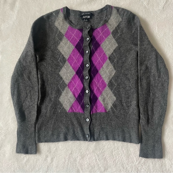Apt. 9 100% Cashmere M Black Purple Argyle Knit Cardigan Sweater Dark Academia