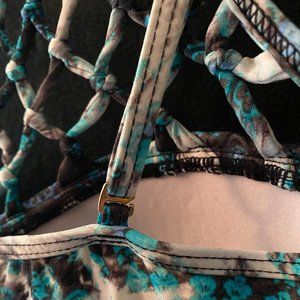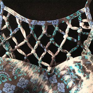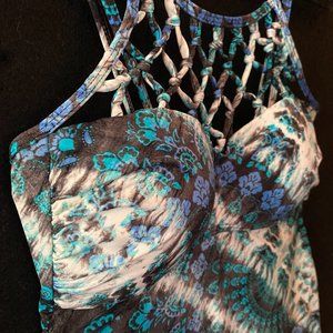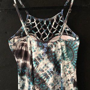 Black & White tie dye with blue bohemian print. Molded A-B cup. Adjustable straps that unhook in the back. Loose fitting A-line bodice. Fits like a size 8.