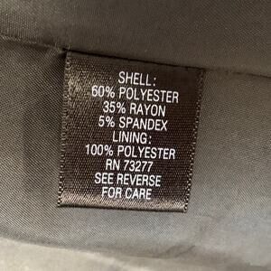 Size 4. The shell is 60% polyester, 35% rayon, and 5% spandex. The lining is 100% polyester.