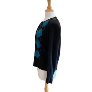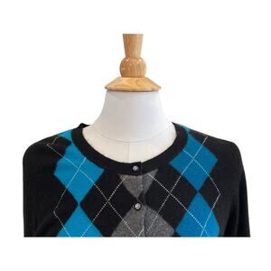 Apt. 9 Black, Blue 100% Cashmere Argyle Preppy Crew Neck Cardigan, Size L
