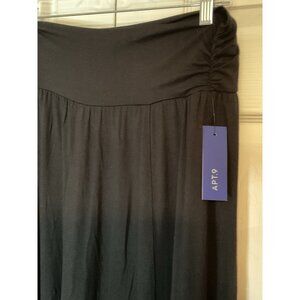 The Apt. 9 Black Midi Skirt with Chiffon Trim is a stylish addition to any woman's wardrobe. This XL skirt features a solid black color with a chiffon trim, perfect for the winter and fall seasons. Made of spandex and rayon, this skirt offers a comfortable and flattering fit for any occasion. The midi length and maxi style make it versatile for both casual and formal looks, adding a touch of whimsy to your outfit.