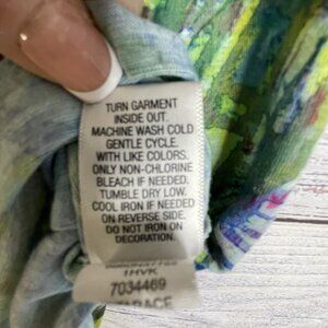This Apt. 9 blouse in size L features a tie-dye design in green and blue with a crochet overlay, green rhinestone accents, capped sleeves and a V-neckline. The lightweight knit fabric is perfect for summer, spring, or fall, and the pullover closure makes it easy to wear for casual occasions, parties, or travel. With a geometric pattern and bohemian theme, this blouse offers a stylish and colorful option for women looking to add a pop of metal-inspired accents to their wardrobe. Machine washable for easy care, this blouse is a versatile and trendy addition to any collection.